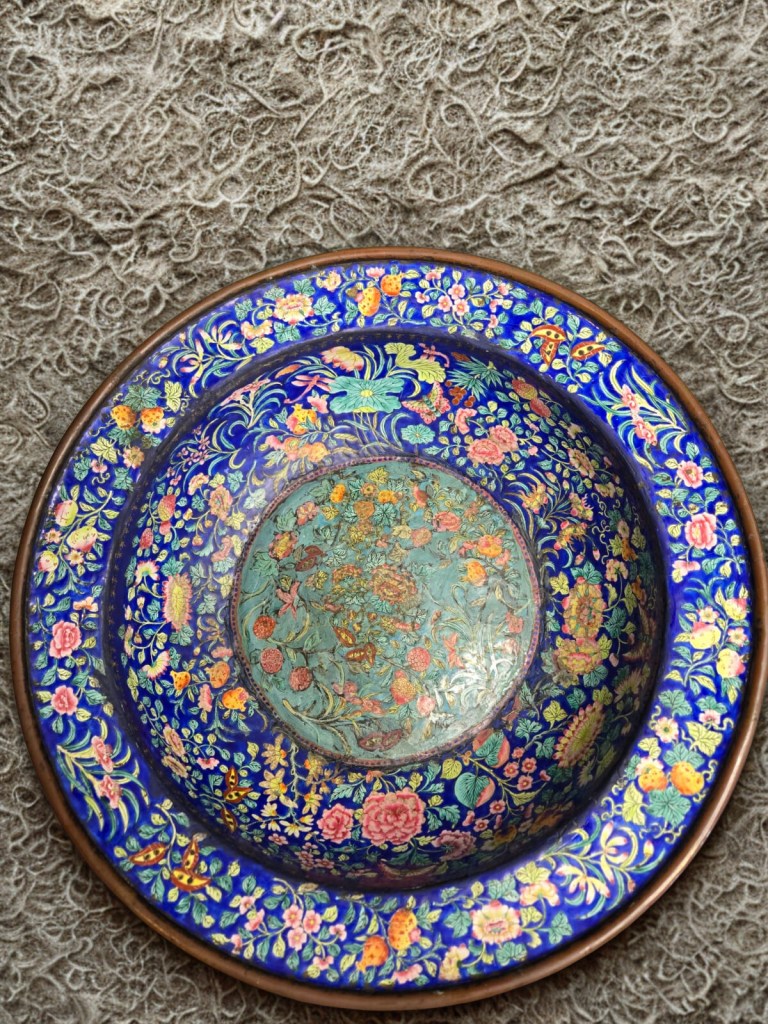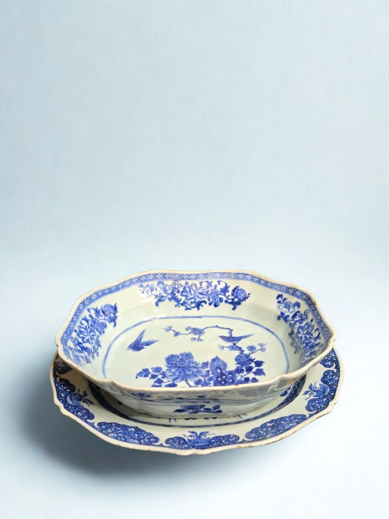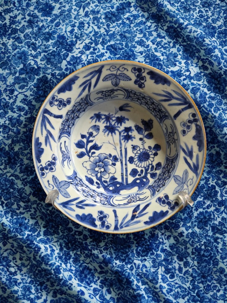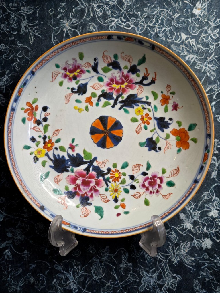densely decorated with bands of flowers and foliage — 10¾in. (27.4cm.) diam. 812gr weight. (minor rim chips and hairline cracks). This is from China, Dynasty Qing, 18th Century. This item was acquired from a Christie’s auction on July 10, 2003 with lot number 366. (1127C)