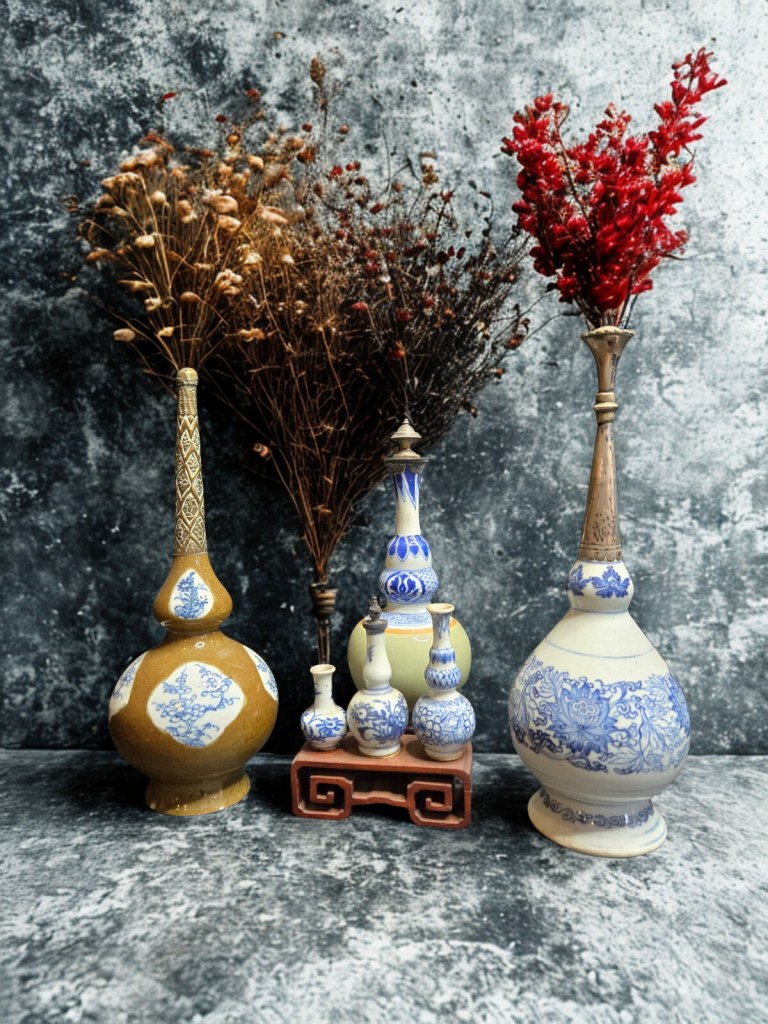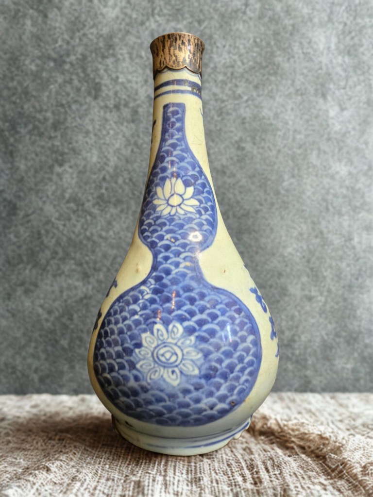 painted with double gourd-shaped panels reserved with lotus sprays on scale pattern grounds, alternating with flowering stems and flame motifs, metal neck mount — 10in. (25.5cms) high, 883gr weight. This item was acquired from a Christie’s auction on October 2, 2003 with lot number 321. (Item Code : 1062C)