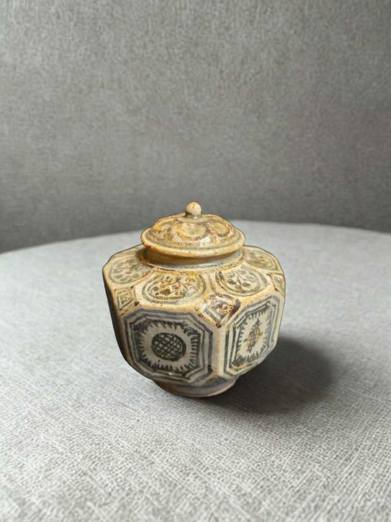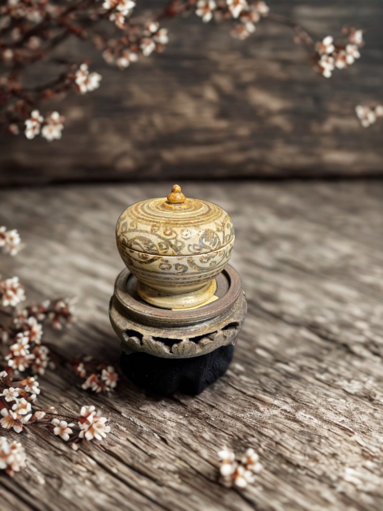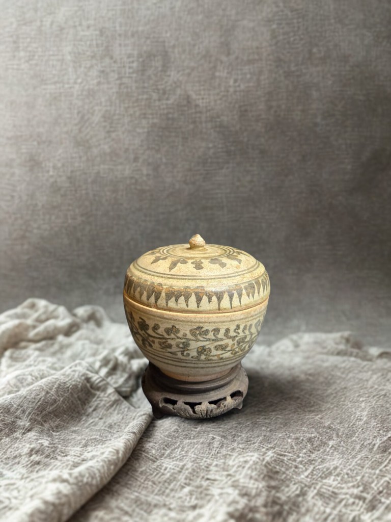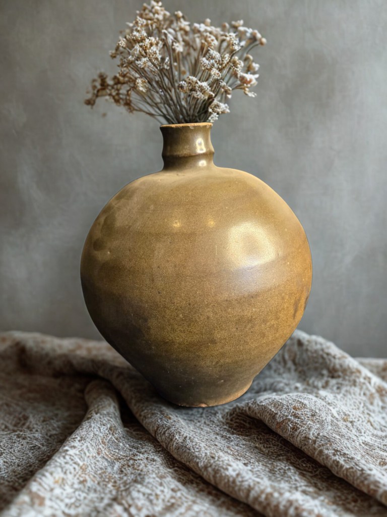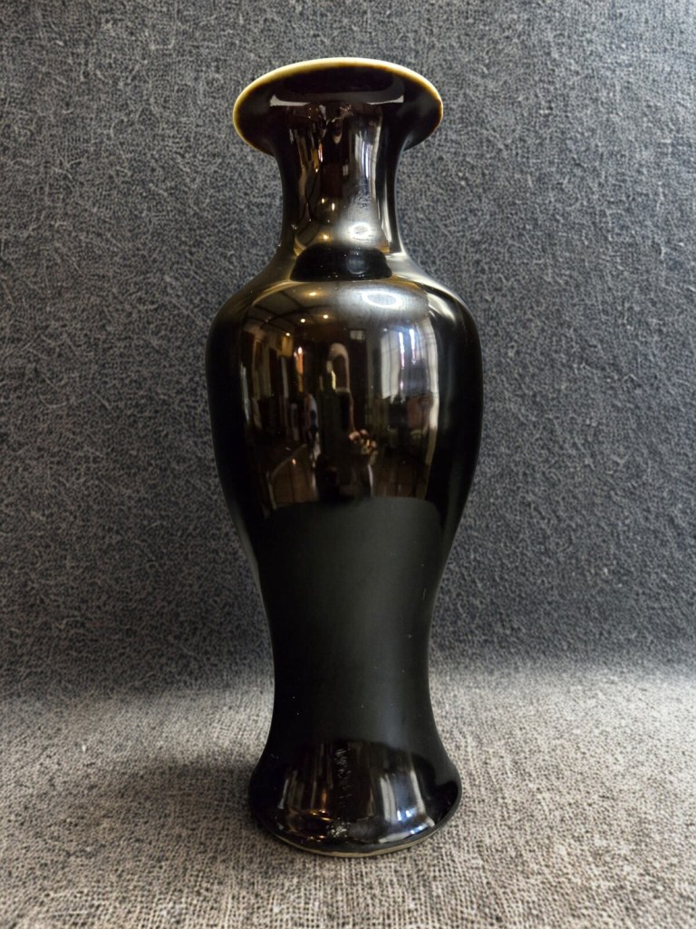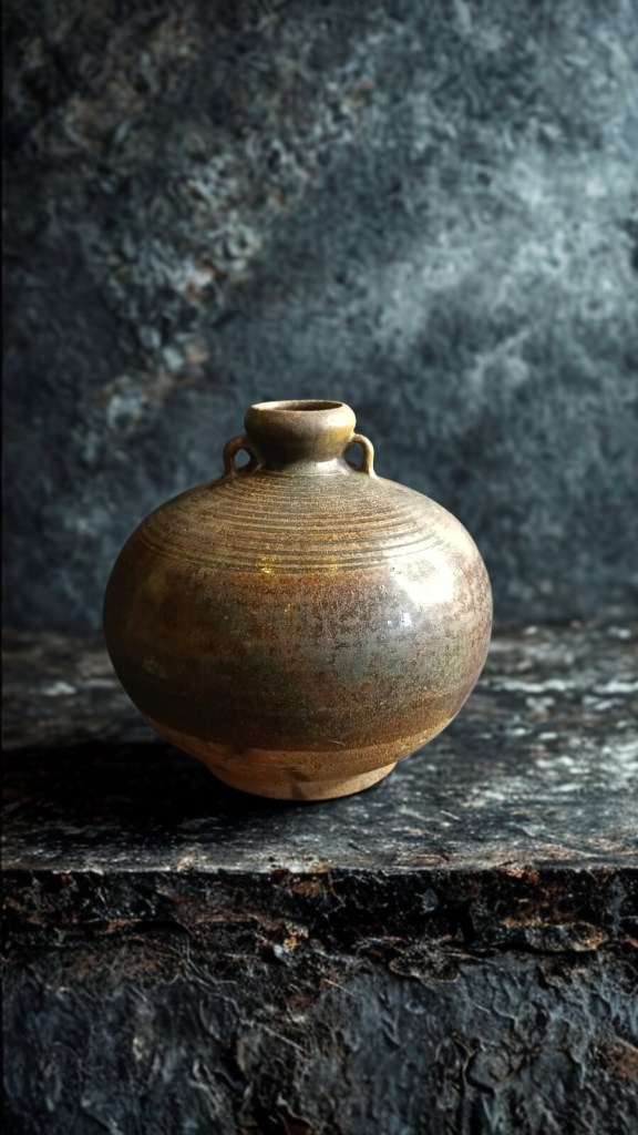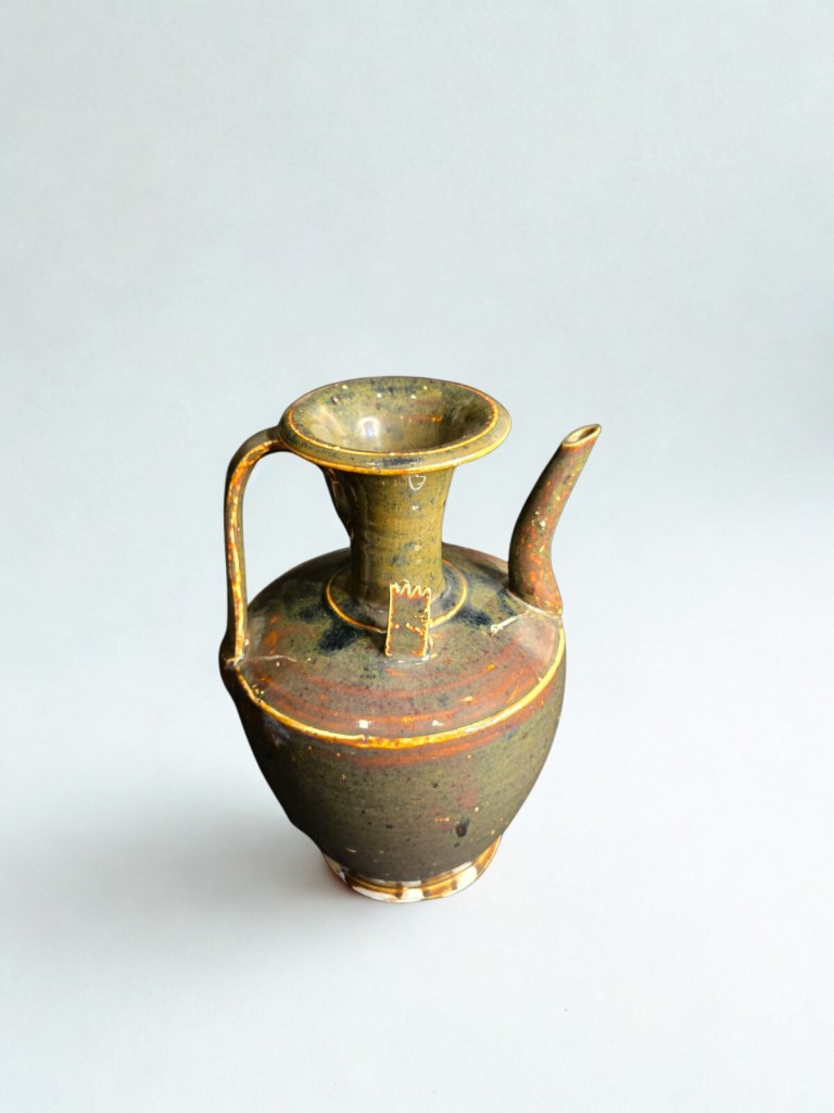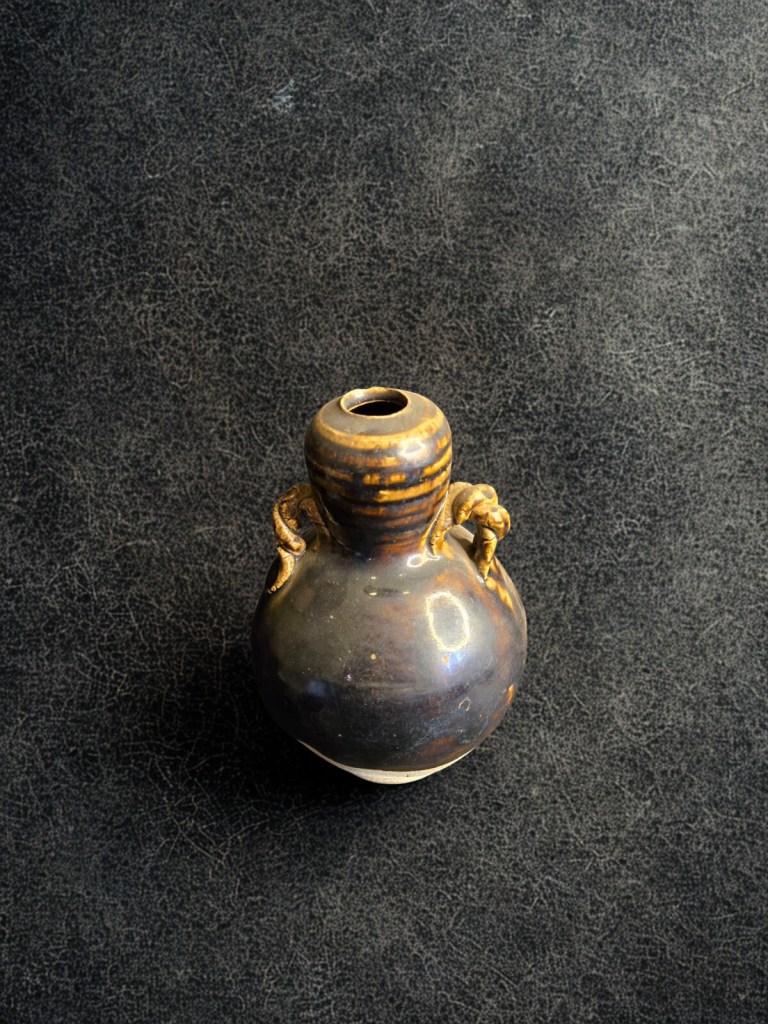 with short waisted cylindrical neck, covered overall in a brownish olive glaze and decorated to one side with an iron-brown abstract scroll motif — 8½in. (21.5cm.) high, 1.439gr weight. This item was acquired from Christie’s auction house on July 10, 2003 with lot 522. (Item code : 1174C)