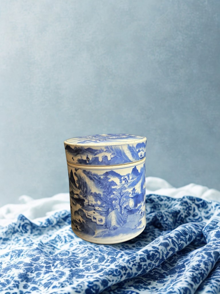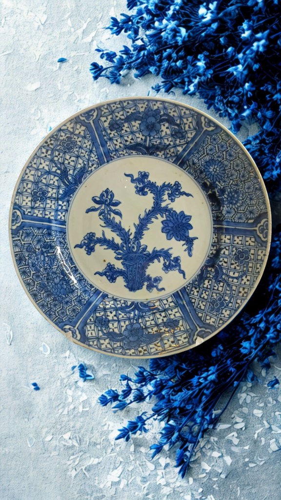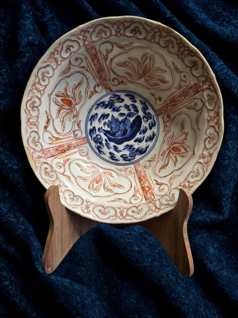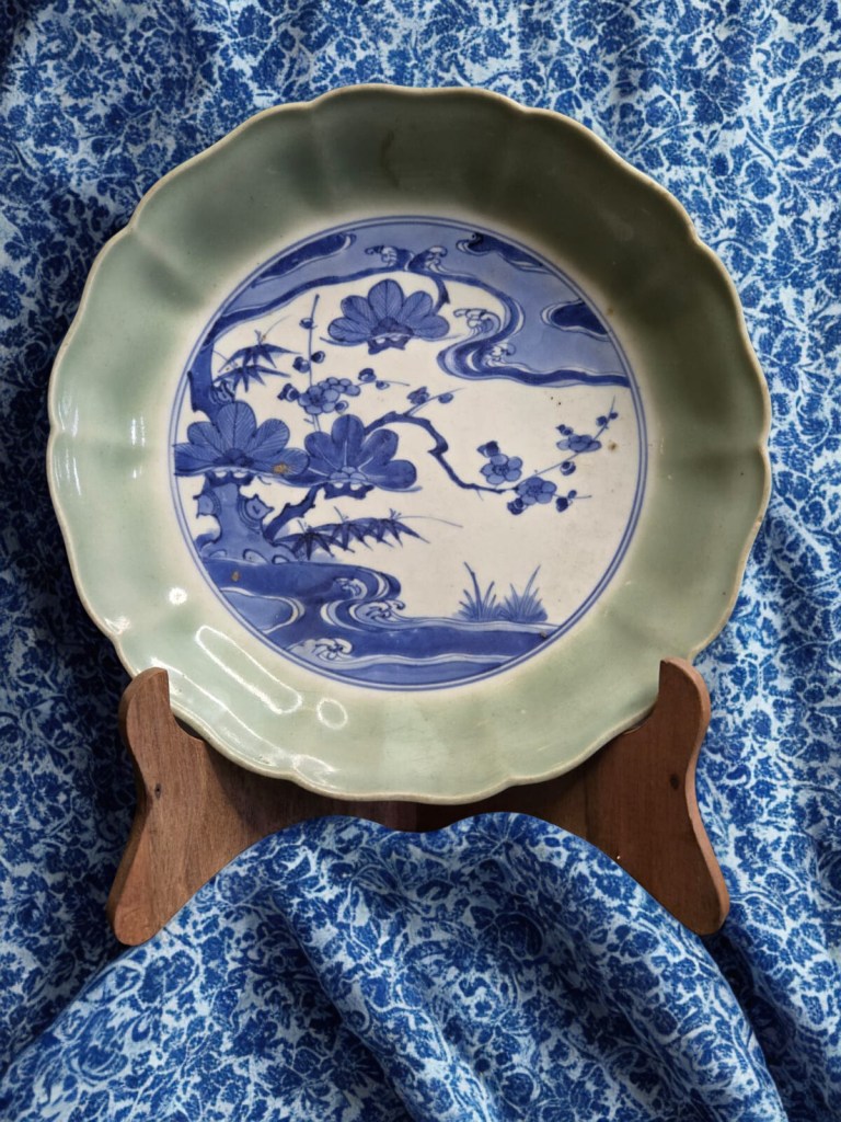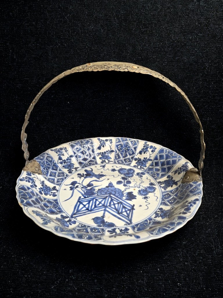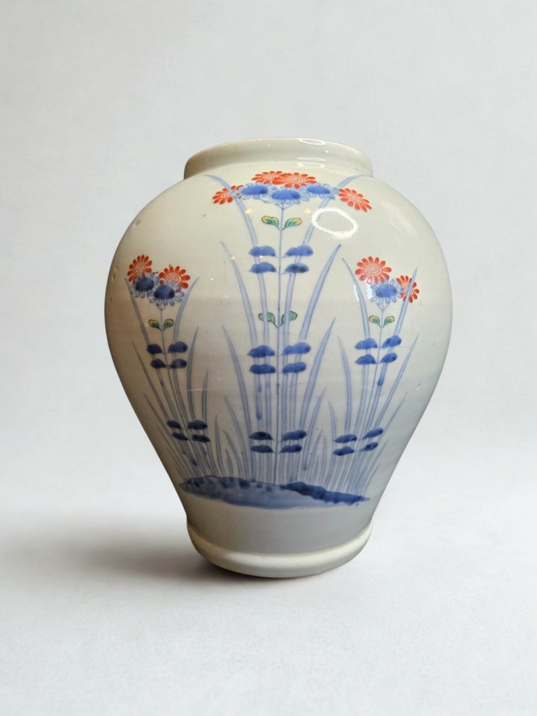 decorated in underglaze blue and coloured enamels with chrysanthemum sprays and reeds. This item was acquired at Christie’s auction house on September 4, 2003 with lot 314. Dimension : -+ 23 cm x 25 cm, Weight : 2.534 gram. (Item Code : 1079C)