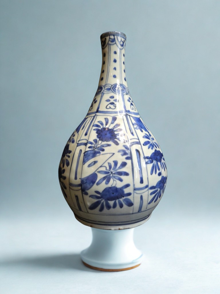 The pear-shaped body freely painted with vertical panels of flowers separated by stylized bamboo stalks below further decorative panels and ruyi borders on the neck; Wanli, the eight facets painted with scenes of scholarly life, including meditating, playing the qin, and philosophical discussion with friends