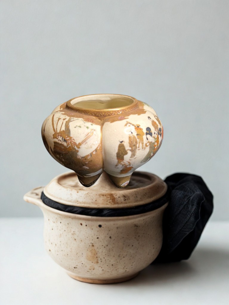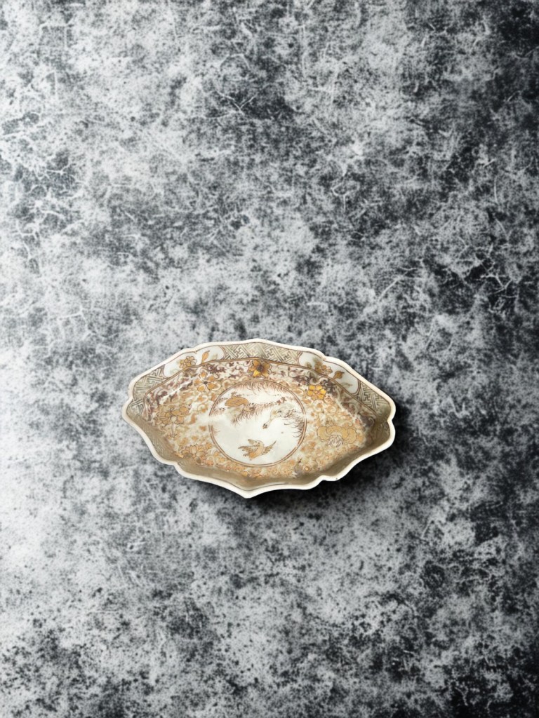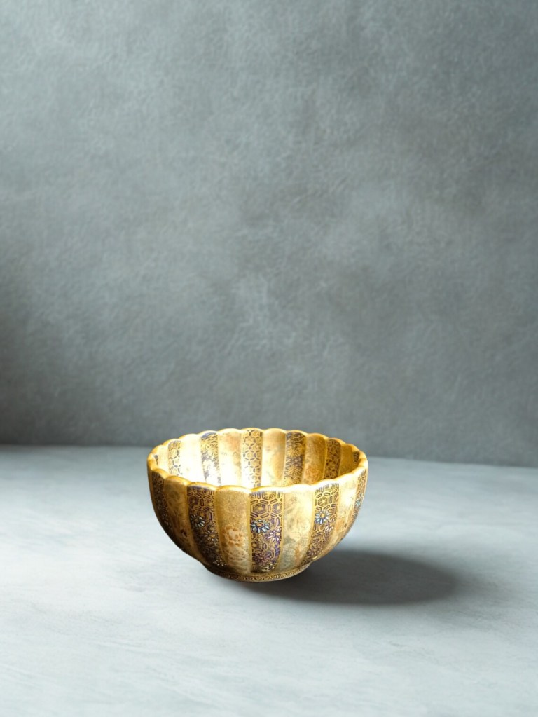 painted and gilt with panels of figures in landscapes and flowering gardens, alternating with blue ground panels reserved with flowers and geometric designs, signed — 5½in. (14cm) diam, 570gr weight. This item was acquired from a Christie’s auction on December 15, 2005 with the lot number 582. (Item Code : 1142C)