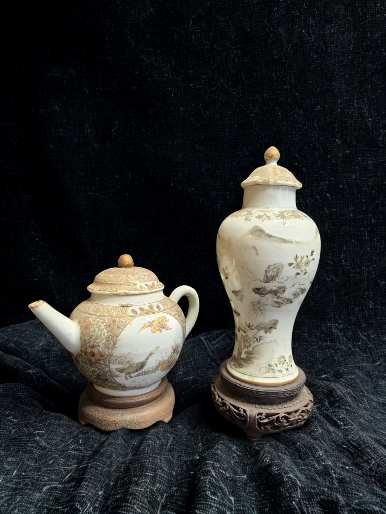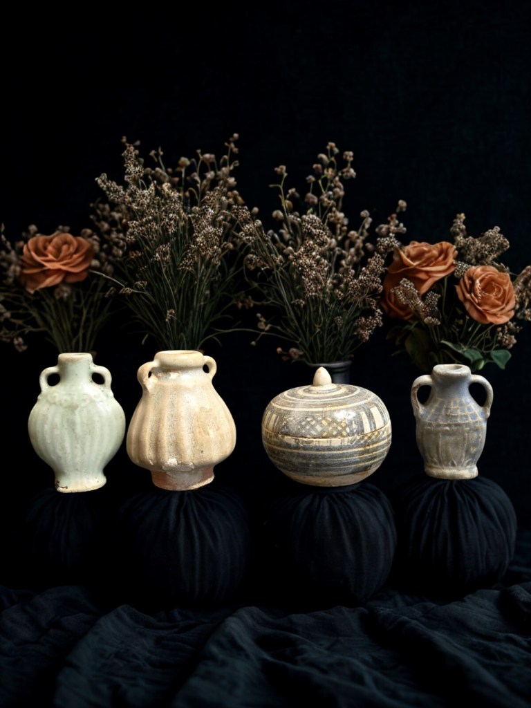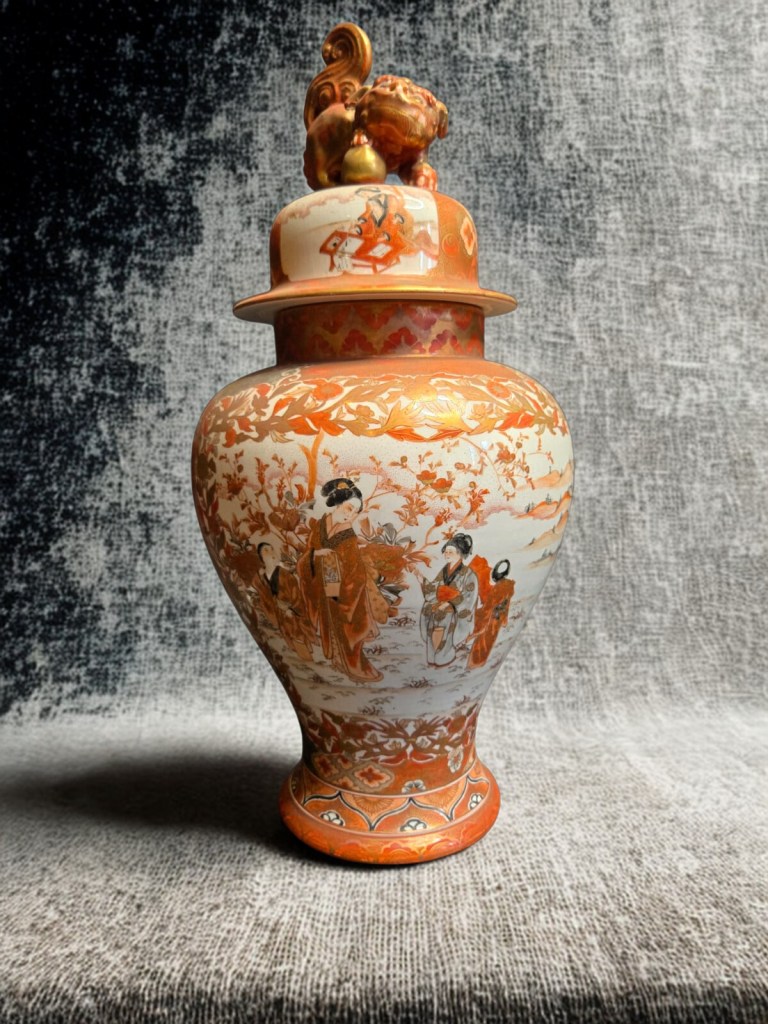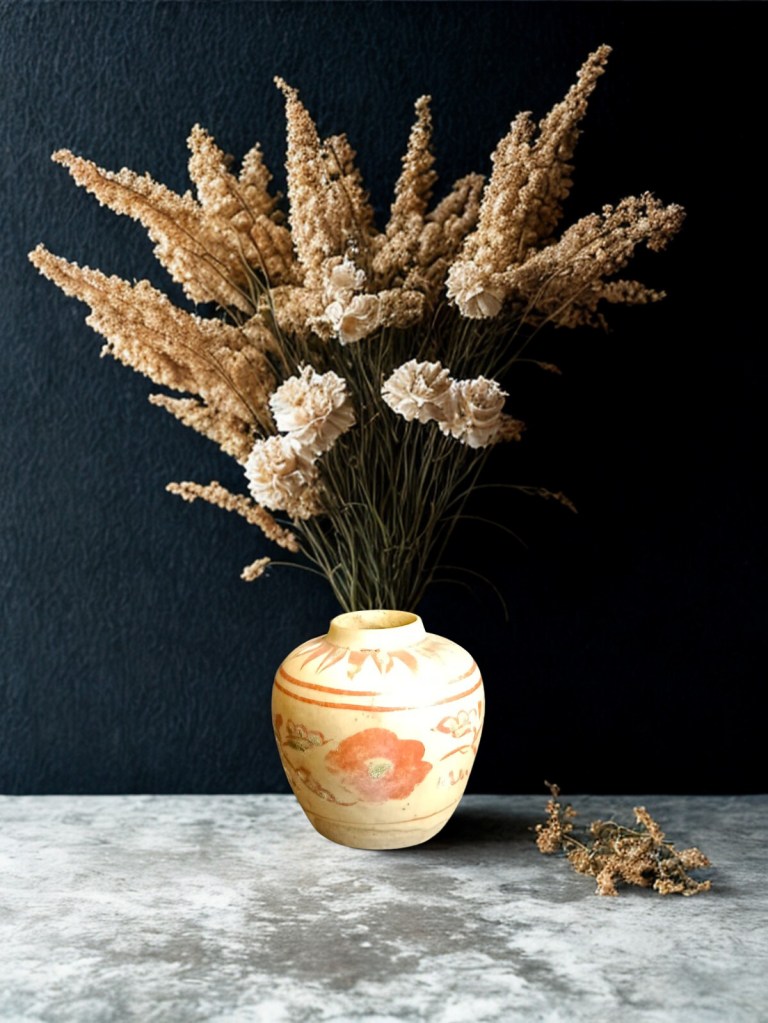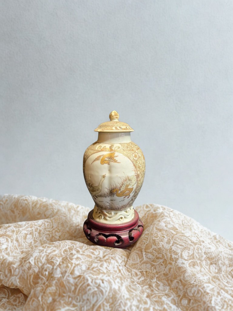 of oviform form with short everted neck, decorated in relief with panels of insects in flight above lotus and blossoming trees and bamboo issuing from rockwork, in ochre, green and rust glazes – 10in. (25.4cm.) high. (1.664gr)This item was acquired from a Christie’s auction on December 12, 2007 with the lot number 1102. (Item Code : 1059C)