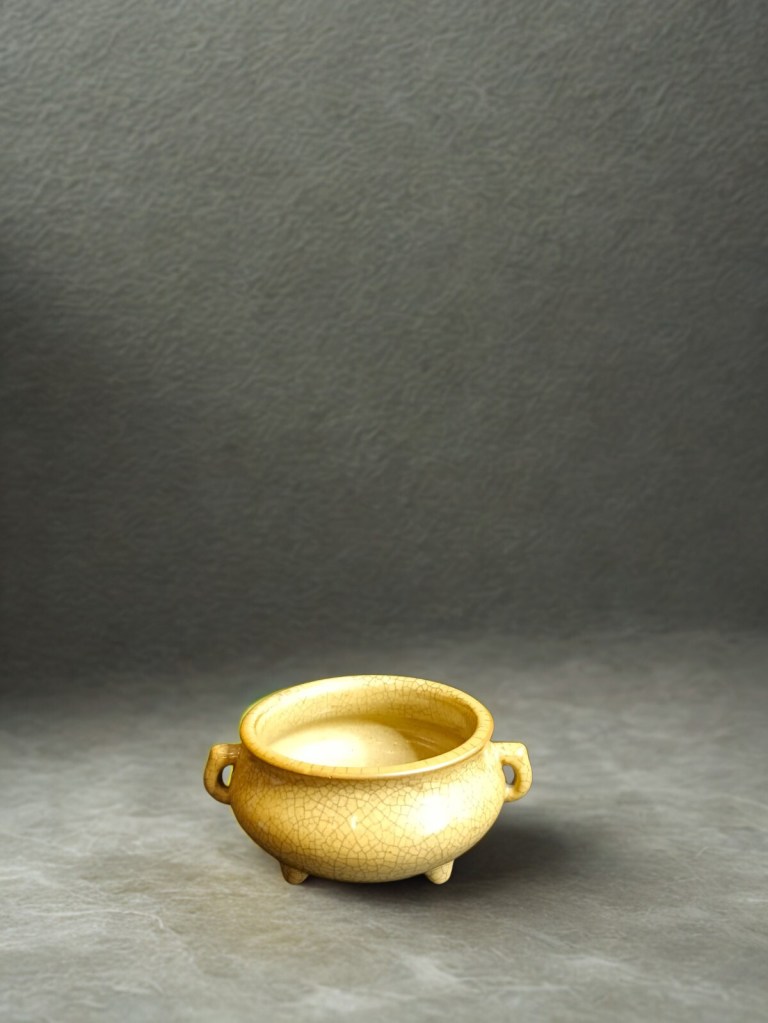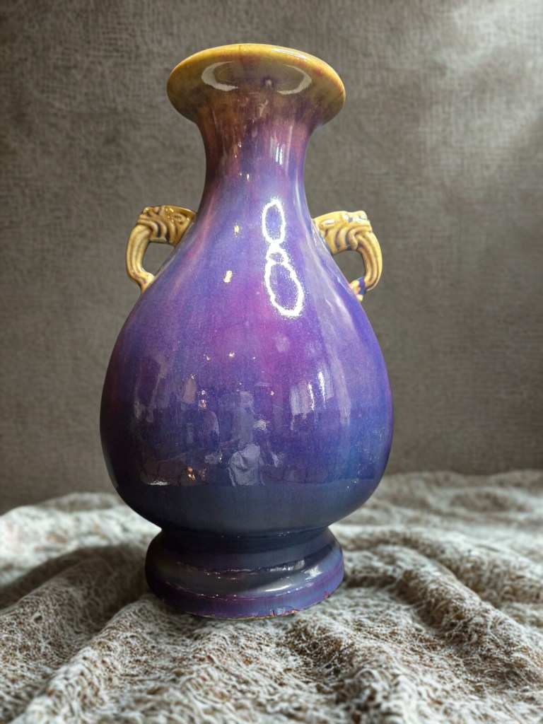 with flaring rim and moulded mythical creature head handles decorated with a thick streaky crackled glaze — 14.5in (37cm.) high. 4.200gr weight. This item was acquired from Christie’s auction house on June 19, 2003 with lot 239. (Item Code : 1114C)
